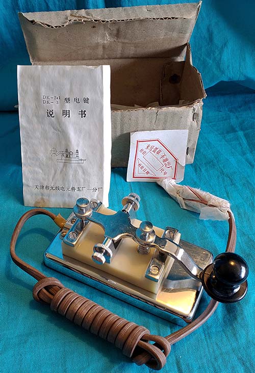 K4, aka: DJG-K4, D-117, DK-714, DK-3 These Chi-Comm hand keys were made for the Chinese PLA for many years and have probably been built by many different manufacturers in China during that time. Early examples, shown in the photo to the left, are from the 1960s but most examples now available are from much later. The earlier versions of these keys are well-made with excellent metal finishes and are very heavy with a cast iron insert in the base to increase the weight with a felt pad to prevent desk scratches. Some examples will have a label that identifies the key and also shows the model number. Both Chinese language and alpha-numeric writing are shown on these labels. Some newer versions of these keys don't have a label but also some of the earliest versions didn't have labels either. Later versions use phillips-head screws while early versions used slotted-head screws. Quality on the later versions is sometimes only fair with many reports of metal finish problems and return spring issues. Sometimes these keys have been listed as "Training Keys" by some of the Chinese surplus dealers. These hand keys can send Morse quite well but nearly all examples will need some rework and "detailing" to function correctly. Most problems involve the return spring action and poor contact alignment. Early keys have better machining quality than the later keys but even the early keys will need some mechanical rework for best performance. All K4-type keys have a pre-installed cable and a Chi-Comm copy of the PL-55 type plug already installed which is quite handy. The Chi-Comm PL-55 is an exact copy and fits standard .250" phone jacks quite well. Typical of later Chinese manufacturing for the military, the knurl on the adjustment thumbscrews and jam nuts is very coarse with sharp crests - adjust with care or maybe with gloves on. |