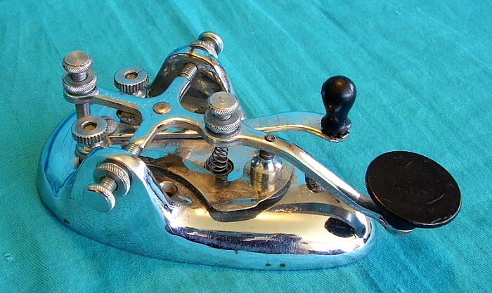 T.R. McElroy "World's Champion Radio Telegrapher" aka: McElroy Manufacturing Corp. - Model 300 Stream Hand Key Ted McElroy was a champion radio telegrapher of the 1930s up into the early 1950s. His receiving speed was advertised as 55wpm in the mid-thirties but ultimately Ted was clocked at over 70wpm. Ted's company seems to officially have been "McElroy Manufacturing Corporation" (officially formed in 1941) but most of his earlier telegraph key name-plates will have "T. R. McElroy - World's Champion Radio Telegrapher - Boston Mass." as the company name. Around 1955, McElroy sold his business to Telegraph Apparatus Corp. (T.A.C.) The Model 300 Stream Hand Key is from 1940. McElroy had built other chrome stream keys earlier and these models had slightly longer and thinner bases. The earliest chrome types (Model 200) have a metal tag on the base just under the knob (~1939.) A second variation will have the "thin base" with either a decal tag or no tag. The last type is the Model 300 with the thick base and no tag. Other models of McElroy Stream keys can be found with either black wrinkle finish bases or the bases were made out of black molded plastic. The Model 300 sold for a mere $2.85 in 1940. The Model 300 is an excellent hand key with a nice feel and great stability due to its shape that puts most of the base weight is at the rear of the key. T.A.C. (Telegraph Apparatus Corporation) also built Model 300 keys after that company purchased McElroy Mfg. Corp. in 1955. |