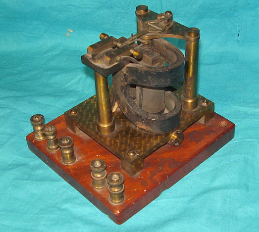 The builder of this beautiful Polar Relay isn't identified. The two solenoids work in conjunction with the "wrap-around" horseshoe magnet. The contact arm remains stationary between the N and S contacts if the solenoids aren't energized. If a connection is made to the two input contacts that is positive then the arm will move to the N contact. If the opposite polarity is made to the input contacts (negative) then the arm will move to the S contact. The connection labels are arbitrary and dependent on the hook up and system. The basic function is that the change in polarity between the two input contacts results in the selection of either arm to N or arm to S with those terminals being the three grouped together on the left side of the board. The input terminals are the two grouped on the right side of the board. The polar relay worked with a different type of telegraph system called the duplex circuit that could run multiple signals on a single wire. This evolved into the quadruplex system the used polarity changes for additional signals on a single wire. This polar relay is beautifully made with turned finished brass sub-base and a mahogany wooden base. It probably dates from around 1900, perhaps a little earlier (it came from Virginia City, NV.) |