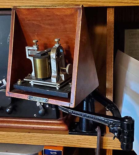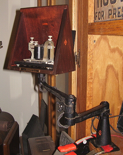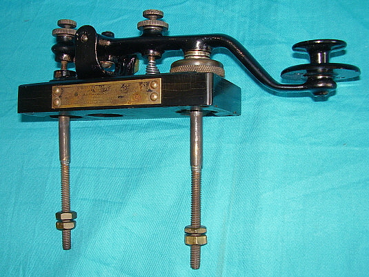 "Straight-Arm" Desk Mount The sounder is the "receiver" of the wire telegraph. Originally the "Morse Register" was a mechanical method of receiving the code but operators soon found that they could "read" the code directly from the aural information heard as the machine operated. This led to Morse's associate, Alfred Vail, building a device that allowed the operators to hear the code directly. The sounders were sometimes installed into resonator hoods to amplify the clicking sound produced. Sounders are rated by the DC resistance of the solenoids. The DC resistance determined the maximum distance between two stations where the sounders were connected directly to the line and were powered by the battery DC voltage source. The greater the distance between stations, the higher the DC resistance of the wire was and therefore the greater the voltage drop across the wire if the sounder solenoids were of a low DC resistance (to ground.) Sounders were produced from the mid-nineteenth century up into the 1960s or so. Otis C. White was located in Worcester, Massachusetts and specialized in cast iron, articulated arm mounting devices, mainly for lighting for desks and machines. The use of the articulated arm allowed the operator to position the sounder resonator hood for best listening depending on the noise and activity in the station area. Active use is probably later than the patent date that is on White's arm, which is 1911. The actual use date of this one shown is probably in the 1920s or 30s. Obvious are the U.S. Army Signal Corps acceptance stamps implying the military use of this example. The sounder used was built by Bunnell and has both solenoids wired to individual terminals. This allowed the user to connect the solenoids in series or parallel depending on the line distance. Each solenoid measures 200 DC ohms so a series connection results in 400 ohms and a parallel connection results in 100 ohms (although the tag indicates "18-400 ohms.") A metal Western Union (W.U. TEL. CO.) tag is mounted to the sounder base implying that WU may have been supplying the Army with their telegraph system in this particular case. The resonator hood is also built by Bunnell and it has a cast metal rear bracket that was probably for paper "messages to be sent." |