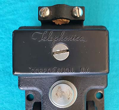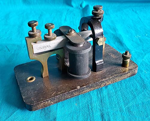Signal Electric Mfg. Co. started out in the 1890s as Menominee Electric Co. since they were located in Menominee, Michigan. The company built and sold telephone and telegraph equipment. The company also built some wireless items like loose couplers and other electrical parts. The name was changed to Signal Electric Manufacturing Company and they remained in business until the 1960s when they were purchased by a Thermos company. This Signal Electric sounder is built a little different from the other sounders shown. Note that the individual pieces, the frame, the anvil and the solenoids are mounted directly to the wooden base rather than mounted to a metal plate that would then mount to the wooden base. The metal base mount provided a permanent alignment of the sounder components. Mounting the sounder components directly onto a wooden base could introduce misalignment if (over time) the wooden base warped or cracked. The 20 ohm DCR solenoids imply that the sounder was intended for relatively longer distances (or less load) when directly operated on the line or driven by a sensitive relay.