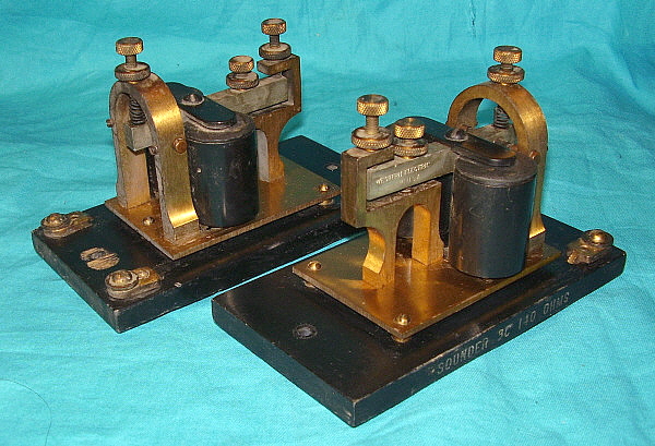 Western Electric 3C 140 ohm Sounders would be for long distance operation direct on the line. Initially, Morse's system used two wires but very soon it was discovered that a single wire could be run between stations and each station could use an Earth ground for the return. Each station had batteries for the potential and large surface area metal plates were buried to provide a substantial Earth ground. With low DCR sounders drawing more current (to ground) to operate the voltage drop across the single wire increased to the point where the sounder wouldn't operate. High resistance sounders didn't draw as much current and therefore could operate for greater distances before the voltage drop increased to the point where the sounder wouldn't function. The system depended on how many sounders were on the line. Since all of the sounders on a line at the station were connected parallel to earth, a greater number of sounders on the line would require each solenoid to have a higher DCR for less total load on the line. Most stations would use the low DCR sounders on a local circuit within the station and the main line(s) would be operating high DCR Telegraph Relays. |