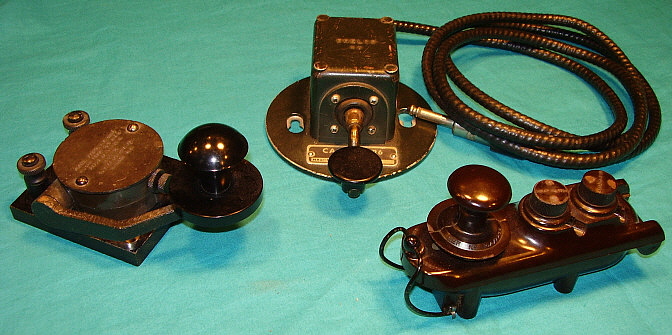 Military Flame-proof Keys Many of the military keys were used with transmitters that were cathode keyed and sometimes had significant voltage on the key itself. Also, other types of equipment may have voltage levels or current levels that could cause sparking when the key breaks contact. This could present a problem in areas where flammable fuel vapors might at times be present, such as airplanes, tanks, ships or submarines during or after an attack where fuel tanks or fuel lines may have been ruptured and leaking. The flame-proof key enclosed the contacts in a sealed chamber to prevent exposure of the possible sparking to any combustible vapors so it would be possible to radio for help. The J-5-A on the left is a Signal Corps key that was introduced in the thirties but was built for many years, in fact the one shown is from WWII - built by L. S. Brach Mfg. Co. The key in the center is a Navy flame-proof key, the CAQZ-26026 built by Brelco Co. The key on the right is a British "Bath Tub" flame-proof key that is made out of bakelite. The bale clamp holds the upper part of the key (which has all of the key parts) down into the tub. These Brit "Bath Tub" keys were used in aircraft and were commonly used with the T1154/R1155 transmitter/receiver. There are many other types of flame-proof keys but all accomplish the same thing, isolation of the key contacts to prevent exposure of possible sparking to a combustible vapor. |