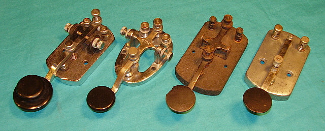 More straight keys,... The key on the left is a Speed-X Model 321 with a Navy "finger rest" type knob and chrome plating around the edge of the base. I have this key's original box in which it was found. Price tag on the box is marked $3.50. The next key is also a Speed-X in the standard base configuration with nickel plating. Both Speed-X keys are Les Logan manufacture (1937-1947.) The next key is a Depression era hand key that uses a lever and bearing support that are made from thin bent sheet metal stampings. These type of keys usually sold for about fifty cents during the thirties. The key on the far right is another really "cheap" key. It relies on the "springiness" of the lever to provide the action with no bearings at all - really a cheap one but at least they polished the pot metal base. |