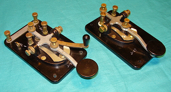 The Lionel Corporation U.S. Army Signal Corps - J-38 & J-47 These are the standard WWII hand key. The J-38 and J-47 were found in many different environments during WWII. The J-38 typically was used in landline set-ups as noted by the secondary set of terminals at the rear of the key marked "TEL" and "LINE." The lever switch must be "closed" for land line reception. Probably the most famous use of the J-47 was as the key used with the SCR-287, the airborne liaison radio station on bombers and transports during WWII. The keys were typically built under contract and most contracts went to Lionel but sometimes other contract manufacturers are found (McElroy made some J-38 keys.) The J-47 is typically found without the shorting lever installed even though the stationary part of the switch is present. This was because the J-47 was primarily a "radio key." J-38 keys always have the shorting lever since they were primarily a "land line key.". Both keys shown are mounted on their original bakelite bases which have the "L" embossed on the bottom to signify "Lionel." The J-38 and J-47 are known for their excellent action and feel. They are still very popular hand keys. |