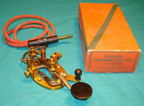 Signal Electric Manufacturing Company M-100 Signal Electric had been making telegraph keys along with other electrical items since the turn of the century. During WWII, they produced hand keys for the military, like this Type M-100 key. This key is fitted with a rubber cable and PL-68 connector which indicates it was going to be used with military equipment. This M-100 was found in its original box as shown. |