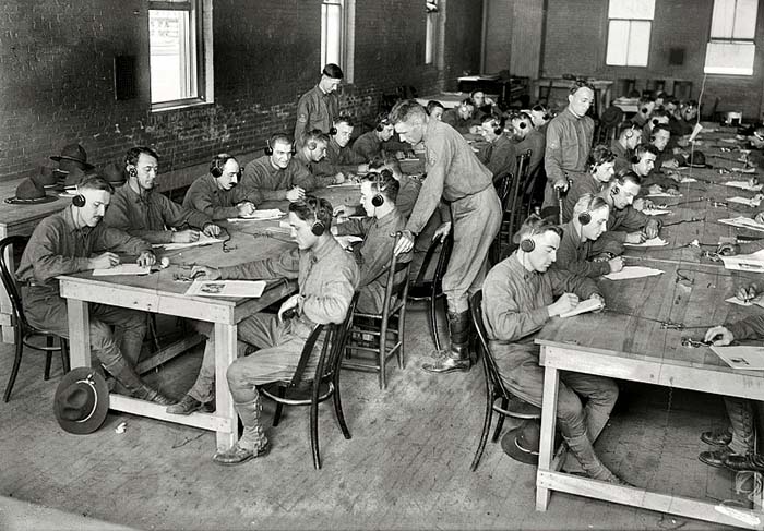 finish. Using the "High Profile" Hand Keys - These Deluxe Hi-Mound hand keys can send Morse very well. However, the "High Profile" key wasn't designed for "USN-style" sending. In fact, with a "High Profile" key it's almost impossible to send "USN-style," that is, seated, relaxed with the forearm and wrist "in-line" and with the forearm fully resting on the bench top with the key placed "diagonal-to-sideways" fairly far back on the bench and using just a slight finger and wrist movement to operate the key. The Navy developed this style for long hours of sending with as little fatigue as possible (see the photo below showing the US Army International Morse school to see how the USN-style of sending looks - I know it's the U.S. Army but they used the same style of sending Morse.) The "High Profile" keys were designed for the "British-style" of sending Morse, that is, with the key far forward on the bench with the key lever and knob facing directly out towards the operator. This requires the wrist and elbow to be off of the table. If you try the "British-style" sending you'll find the "High Profile" key is pretty easy to operate and capable of sending Morse accurately. >>> |