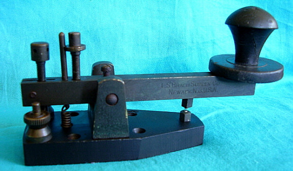 L. S. Brach Supply Co. U.S. Army Signal Corps J-6 The J-6 was used by the Signal Corps for the small airborne spark transmitters that were in use at the end of WWI up into the early 1920s. Usually the spark transmitter was very low power and the high voltage was supplied by an air-driven generator that was mounted in the struts of the landing gear. The receivers were powered by batteries. Communications was primarily for aiming ground artillery during late-WWI. The J-6 key is mostly brass construction and is mounted on a hard rubber base that was mounted by screws to the wooden frame work of the airplane. The knob became the standard for early radio telegraph keys for the Signal Corps, especially those keys from Brach - see the Brach J-5-A below in "Flame-proof Keys." Of note on the J-6 is the location of the return spring. It is behind the trunnion pivots and "pulls the lever down." When pressing the knob down, the key contacts make no noise. However on the release, you will hear a "click." This is the opposite of nearly all other Hand Keys. The resulting aural message results in user confusion and difficulty using the key. But, the J-6 was usually installed in an open cockpit biplane and the "spotter" wore a headset so the opposite "clicking" wasn't even heard during normal operation. |