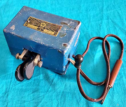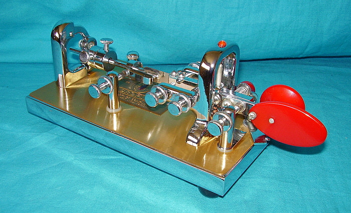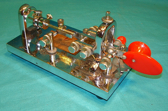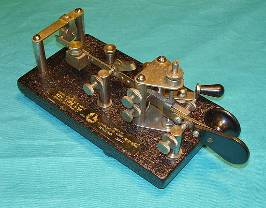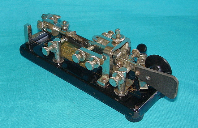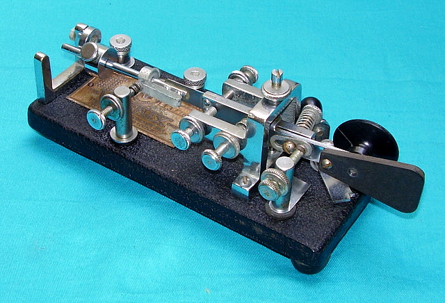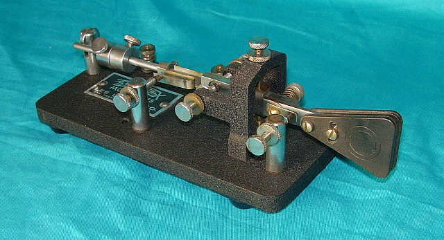 Lever (aka: The Original) Horace Martin's first all-mechanical, semi-automatic key design was the Single Lever dating from 1904. Almost all later "bugs" are based on this design that utilizes a horizontal vibrating pendulum to send a stream of dots the speed of which is determined by the placement of weights on the pendulum. The Original was called the Single Lever at first, then Horace Martin's Original and then just the Vibroplex Original (about 1940.) The example shown to the left is from 1919 with the typical Japan Finish base with gold stripes and the "Vibroplex Company" tag the was used from 1915 up to about 1921. Most of the early Vibroplex key bases were painted with a lacquer called "Japan Finish" and then gold pin stripes were added. Nickel plated bases were also available (one of the earliest Single Levers reported has a nickel-plated base.) Sometimes other base colors turn up,...blue and dark red have been seen. Cobalt Blue was used on the No.4 key starting in 1914. It's not impossible that some Single Lever bases might also have been painted blue at a customer's request about that time. It's also reported that some very early keys were built with non-plated brass parts on Black Japan bases. Of course, most of these non-standard colors were post-sales, end-user paint jobs. Black Japan finish with gold stripes was the most common paint scheme used. Regularly available but considered "Special" paint schemes were first advertised in June 1929 (QST,) with paint colors available in Red, Blue or Green lacquer in addition to the standard Black Japan and Nickel-plate. Black Wrinkle finish came along around 1939. Deluxe Originals were introduced in 1940 with chrome bases, red knobs and jewel bearings. Then in WWII, to conserve chrome, the civilian Deluxe versions used a dark gray wrinkle painted base but the red knobs and jewel bearings were retained. Chrome base for the Deluxe returned post-WWII. Black wrinkle returned for the Standard (what Vibroplex called the non-Deluxe keys) for a short time after WWII but the company went back to gray (though a lighter shade than what was used in WWII) about 1958. In the late-1970s, brown and beige colors were used on some of the bases for a short time. Standard Originals are still available from Vibroplex. |