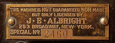 Novelty Company In late-1913, Max Levey, owner of "ATOZ Electric Novelty Company" started producing an almost exact copy of Martin's Vibroplex Single Lever. Levey probably thought that since ATOZ was located in Chicago, the distance between his company and Martin-Albright in New York afforded him some isolation and protection against any legal action. But, perhaps out of contempt, Levey went even further and named his copy bug "The Improved Vibroplex." It certainly got J.E. Albright's attention and a law-suit was quickly filed in the state of Illinois, in December 1913 (although the suit was filed with Nellie Bellows-Mecograph as the plaintiff.) The court's ruling in Albright's favor came down in March 1914. The judge was so astonished at Levey's impudence to sell these "knock-off" copies with the name "Vibroplex" as part of the key's identification, that he wrote a two-page decision admonishing Levey to back up his ruling. Albright immediately began advertising the court's decision and also to threaten (in the ads) that all infringers would soon be sued. He even named the companies that were next on his "hit list." But, there were so many small companies building patent infringing "knock-offs" that Albright decided on a different, more cost-effective approach, rather than going to court. Albright began advertising that if a professional telegraph operator was using a "knock-off" key, he and his company could be held liable for "unlicensed use" of that key. By careful timing of advertising and with a certain amount of threats (like the threat to Western Union over their many operators using non-licensed keys,) Albright had many of the non-Vibroplex key-owners and wire companies worried. Then Albright advertised that he would sell licenses for these non-Vibroplex keys. For two-dollars, an "Albright license" could be obtained that would protect the non-Vibroplex key owner and employer from future legal action. The two-dollar license fee included a metal tag that read, "THIS MACHINE IS NOT GUARANTEED NOR MADE BUT ONLY LICENSED BY J. E. ALBRIGHT 253 BROADWAY, NEW YORK. SPECIAL No. xxxx." An Albright tag is shown in the photo below.