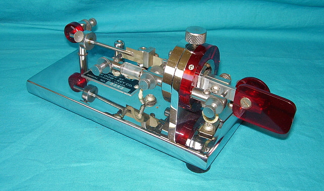 >>> A few years later and the keys were carrying tags indicating they were made in Warren, Minnesota with Winnipeg listed as the distributor for Canada. Paul Dow retired in 1956, leaving the operation of Dow-Key to his son, Gordon. Paul Dow died in 1957 and in the same year, Gordon moved the company to Thief River Falls, Minnesota. 1957 was also the last year that Dow-Key made speed keys. The Dow-Key Company had been slowly changing and adding to the product-line with RF switches becoming their specialty. The Dow-Key coaxial relays are probably the best known to hams of these types of products. Dow-Key has had several owners but is still in business building various types of RF switching devices. How it Works - The Universal Rotary Key uses a tubular, flanged housing in which the main lever is mounted. The trunnion bearings are adjustable both top and bottom. Once the main lever is mounted in the tubular flanged housing this assembly can be inserted from the backside though the vertical base mount and lightly secured with the knurled thumb screw. Then the red plastic retaining ring with dash contact mount is placed over the protruding portion of the flanged housing. The red plastic retaining ring is secured by lightly tightening the two philips head screws. To rotate the entire flanged housing and main lever the knurled thumb screw is loosened and the mechanism rotated to the desired angle and then the thumb screw lightly tightened to secure that position. Note that the dot contact is mounted with a clear plastic standoff on the backside of the flanged housing. Note that the connections to the dot and dash contacts are via flexible wires. This is to allow unhindered rotation of the mechanism. Total movement is about 270º with vertical being the halfway point. Though it's possible to rotate the mechanism all the way CCW and maybe use the dash contact side as a straight key, the mechanical limits don't allow rotation to a completely horizontal position. Besides, it was never the intent of the Universal to double as a straight key. A fully adjustable, comfortable-to-use, speed key were the design goals of the Universal. The Deluxe Universal Rotary Key shown is from the very early fifties. It has a tag indicating that it was built in Winnipeg, Canada. The Deluxe Universal is a stunningly beautiful key with its transparent red plastic, transparent clear plastic and chrome features. Originally, the two flexible connecting wires had a green coating to contrast the red plastic. Unfortunately, the green coating wasn't very durable and most of it has "fallen off" leaving the just white cloth insulation. The precise machining of the various pieces results in a very smooth rotation when adjusting the sending angle. The Dow-Key Deluxe Universal has a very wide range of speed and, since it can be set up to any angle of operation, it's the ultimate in sending comfort. I've tried different angles and Paul Dow was actually "on to something." For me, a slight angle CCW does feel nice. You do have to readjust the contacts slightly if the angle change is dramatic but it's not necessary for small changes. I've noticed that sometimes one will see a standard bug that has a slight "twist" in the front part of the lever (like the Buzza 100 example I have.) I guess that was one way to get a comfortable feel. |