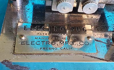 The Electro Mfg. Co. started out in Fresno, California in the mid-1920s. They produced the Electro-Bug and also the Electro-Bug Junior (that didn't have the electromagnet.) Most Fresno-built Electro-Bugs date from the mid-to-late-twenties. Although the name "Speed-X" doesn't appear on any of the Electro-Bugs, much of the hardware is very similar to later Speed-X bugs. Especially noting the "T" frame and the damper style. Stewart Johnson (aka Steward Johnson and also Stewart "Red" Johnson) became associated with Electro Mfg. Co. around 1930. He purchased the company while it was located in Fresno and subsequently moved it to San Francisco. Johnson continued to build Electro-Bugs in San Francisco for a short time, probably into the early thirties. By 1934, Johnson was producing a fairly standard semi-automatic bug that was "Distributed by the San Francisco Radio Exchange" according to the tag mounted on the key base. Around the same time (1934,) Johnson changed the name of Electro Mfg. Co. to Speed-X Radio Mfg. Co. The design of the keys also changed becoming a very standard semi-automatic key based on the Vibroplex Single Lever design and resembling the Blue Racer in size. Shown to the lower right are close-ups of the two metal tags from the two Electro-Bug keys shown above. The left photo shows the Fresno tag and the right photo shows the San Francisco tag. |