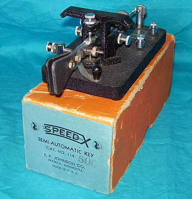 E. F. Johnson Company SPEED-X Semi-Automatic Key CAT. NO. 114-500 The Cat. No. 114-500 was the standard version of the plated bug shown above. The base and frame are painted black wrinkle finish and the hardware is chrome plated. This Speed-X key was found in its original box in unused condition - the two paddles weren't even mounted to the lever. What was interesting was where I found the key. I always have made it a point to go to the Hot August Nights annual car swap meet held in Reno. I even went to it when it was called Harrah's Auto Swap. Hot August Nights has always seemed to produce something radio related over the years. I've found several telegraph keys there many times. Well, this Johnson 114-500 was at a HAN swap probably around 1995 or so. I had actually been through the entire swap and was standing beside a table that I thought I had already looked at. I was thinking if there was anywhere else to look in the swap area. I happened to look directly down at the table that I was standing right next to and I saw a familiar-looking orange box with a blue label. I wondered if the bug was actually inside. I was amazed when opening the box I found that the bug was untouched, never used, in mint condition. I didn't even have to ask the dealer what the price was, he came over and volunteered that information. Money quickly exchanged hands ($30) and I had the bug. At home, I mounted the paddles with the hardware provided in the box. Unusual that the bug was never used and is still pretty much that way. |