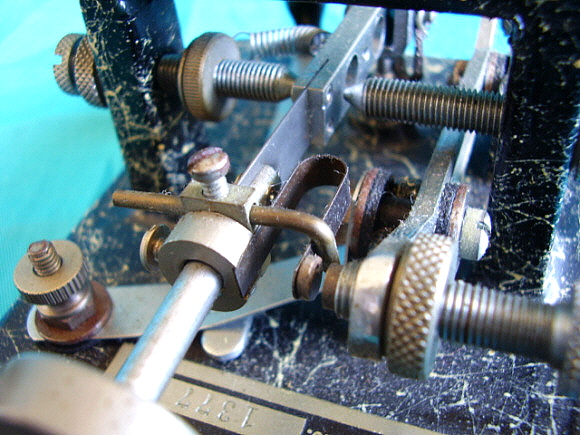 does its job smoothly and one can send great Morse with this design. The Double-Lever went through several changes during its production history. The Double-Lever shown to the left photo is the early style with the "Square Cut-out Frame." It probably dates from after 1915. The date is arrived at since there isn't a serial number stamped on any parts which implies that the serial number was on the tag, which is missing. Having the serial number on the tag started when the Vibroplex Company was formed in 1915, so the key dates from that period or a little later. The early style had a two screw clamp that allowed adjustment of the vertical placement of the lever on the trunnion axle. Later versions didn't have this feature with the trunnion axle being press-fit into the lever. However, like most bugs, the trunnion bearings can adjust the height placement of the lever within the frame in either design. The Double-Lever shown on the right is the last type made, called the "Clover-leaf Frame" because of the inside cut-out shape of the frame. It dates from around 1918 (SN:64103.) Note that this later key has a damper like the Single Lever Original. The Clover-leaf also has the dot lever stop mount cast as part of the frame instead of a separate piece as on the Square Frame. As can be seen in either of the photos, the dash lever mechanism is completely separate from the longer dot lever and pendulum. The Double-Lever was available from about 1911 up to about 1926. |