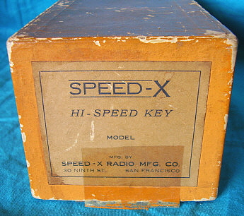 SPEED-X Radio Mfg. Co. Stewart Johnson Stewart Johnson had changed the name of the Electro Mfg. Co. to Speed-X Radio Mfg. Co. sometime after he moved "Electro" from Fresno to San Francisco. The company's new address was 30 Ninth St. in San Francisco. Johnson stopped building the Electro-Bug (probably around 1932) and started to produce a much less complicated to build and less problematic to operate type of semi-automatic key. Early Speed-X bugs will have a label indicating they were "Distributed by the San Francisco Radio Exchange" and will have a somewhat different type of front-mounted bearing support on the main frame. This bug was redesigned to be a very close copy of a standard Vibroplex Single Lever although more like the Blue Racer in size. This new design bug was called "Speed-X Hi-Speed Key." Johnson produced these type of Speed-X keys from around 1934 until he sold a partnership in his company to Les Logan in 1937. The Speed-X shown is the later version bug. These Stewart Johnson Speed-X keys have no identification at all. It's small size is comparable to the later Les Logan Model 515 Speed-X (or the Vibroplex Blue Racer.) Even though there's no identification on this bug, it was found in unused condition in its original Stewart Johnson Speed-X box. |