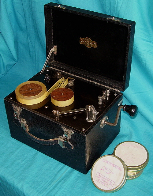 Shown in the photo to the right is a fairly early Instructograph that uses a wind-up motor to drive the tape pickup spool. Note that one this early version, the tape spools are made of wood. Also, the tape containers are metal tins with "Continental" printed on the lid. Each tin is numbered for identification. Note also that this machine has a small pointer knob at the upper left of the panel. This is the power switch and volume control for the battery-operated audio oscillator that is mounted inside the cabinet. The oscillator uses a single type 30 vacuum tube. This excellent condition Instructograph is complete with all of the tapes, extra spools and a spare type 30 tube. It belonged to W3ON. |