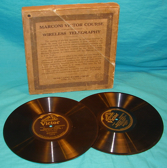 Victor Talking Machine Company Marconi-Victor Course - Wireless Telegraphy When the USA became involved in WWI (April 1917) the Army and Navy realized they were going to need wireless operators in the field and on ships at sea besides the trenches. Training time would be shortened if the men enlisting already knew International Morse Code. What better way to learn the code at home than by phonograph record. The Victor Talking Machine Company offered a six record set along with booklet in 1917 to assist the military in providing a method to have future enlistees already know the code. The records are 10" diameter and are acoustically recorded, that is, all the speaking and the code "buzzer" were performed before a large horn that directed the sound energy down to a record cutter that made the master. The sound of the transmitted code signals sounds like a rotary spark gap type transmitter but is probably a large mechanical buzzer. In the first record for learning the alphabet, the announcer yells "A" and then the buzzer is heard to send "dit dah" at about a ten wpm speed. Then the announcer yells "B" - "dah dit dit dit" from the buzzer. This same format is used for learning the letters and numbers. The records progress from learning the code on the first record and then on to building speed up to full messages sent on the last record. Recordings have been used to learn International Morse for years after this Marconi-Victor course. Several companies issued records over the years. Many hams remember the Ameco Code Course records. When I was a teenager, I learned the code from an Ameco Code Course LP record that I checked out of the local library. The recording medium went to tapes and then CDs. Computer programs have also been instrumental in instruction and building code speed. Learning to receive International Morse was certainly the most difficult part of the task. But, learning to send Morse and to be able to "handle a key" was also very important. It required tools like the following equipment. |