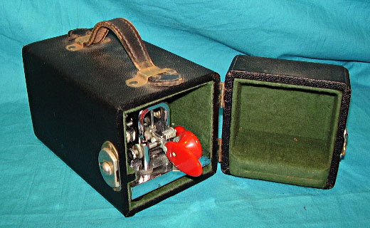 photo left: This is a late Instructograph that runs on AC and has an internal solid-state audio oscillator. Note the larger box provided for tape storage and instructions. |