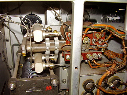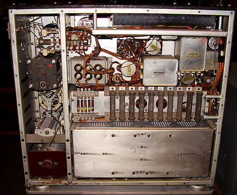 The photo to the left shows the BC-375 with the back cover removed. The entire left side of the chassis (when viewed from the rear) is the wide range antenna coupler. Top center to right is the large tapped resistor that is used for the proper filament voltage settings via the adjustable links. The large cans in the center are the audio input transformer and the modulation transformer. The TU is plugged into this BC-375 so the bottom metal case is the rear of the TU. In the upper left (and in both compartments) is the elaborate antenna switching relay that also accomplishes the remote receiver standby function. The ball contacts on the left side are for the antenna switching between transmitter and receiver while the right side of the relay has the flat contacts for receiver standby and some of the transmitter functions. This relay nearly always needs to be tested, cleaned and adjusted before it will work correctly. If this relay has been carelessly readjusted then the sequencing of the relay contacts will have to be checked. The depots had a test device that gave a visual indication of proper sequencing when relay contact adjustment was performed. Luckily, most problems are due to dirt and minor corrosion on the contacts. |